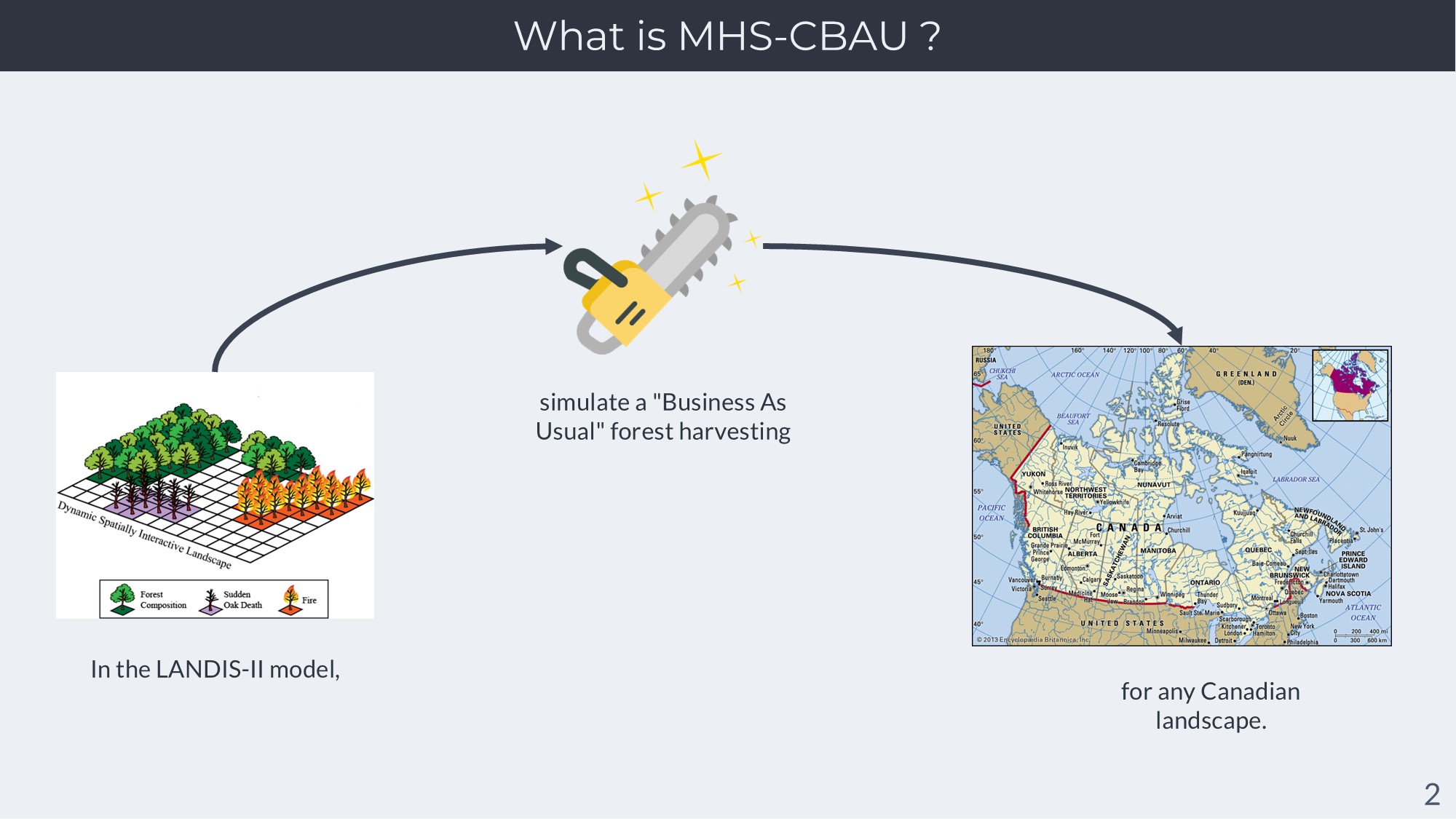MHS-CBAU also contains scripts to generate all of the input files you will need quickly for any study landscape in Canada, and is also made to be customized so that you can keep the structure of the scripts while implementing more complex forms of forest management (e.g. TRIAD zoning, Functional Complex Network, Climate Smart Forestry, etc.; sky’s the limit !)