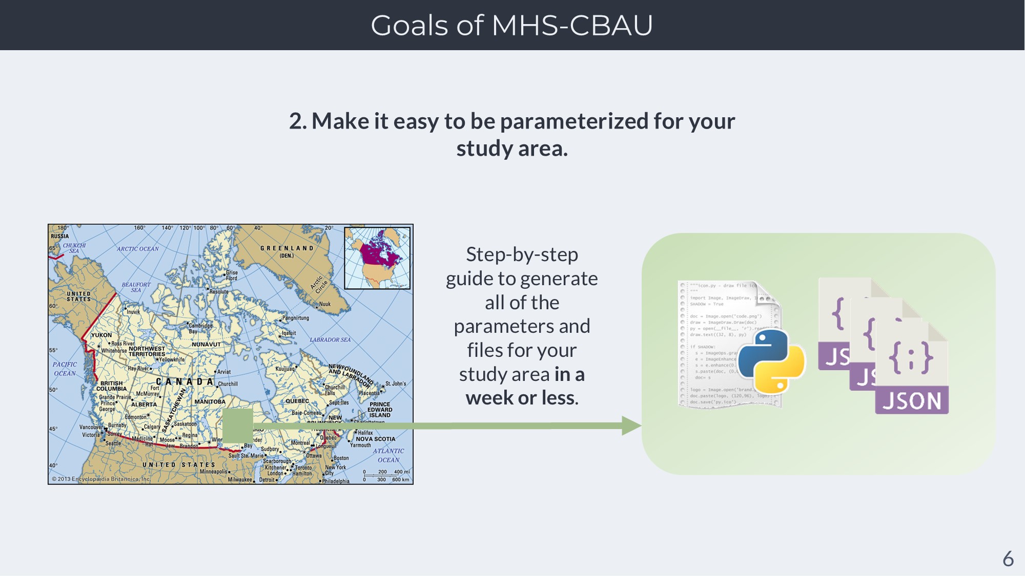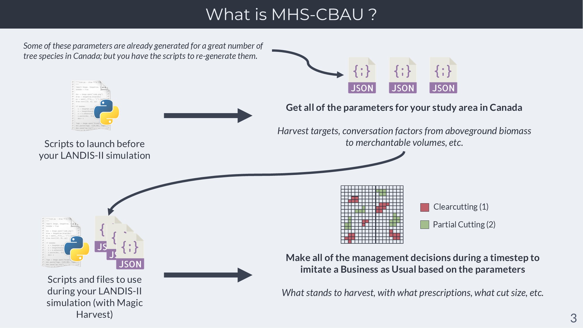 Goal 2 : make it easy to be parameterized for your study area. MHS-CBAU comes with a step-by-step documented guide to get everything ready for your study landscape in less than a week. It comes with scripts that will automatically generate inputs for you, and files that already contain parameters for almost every tree species in Canada.