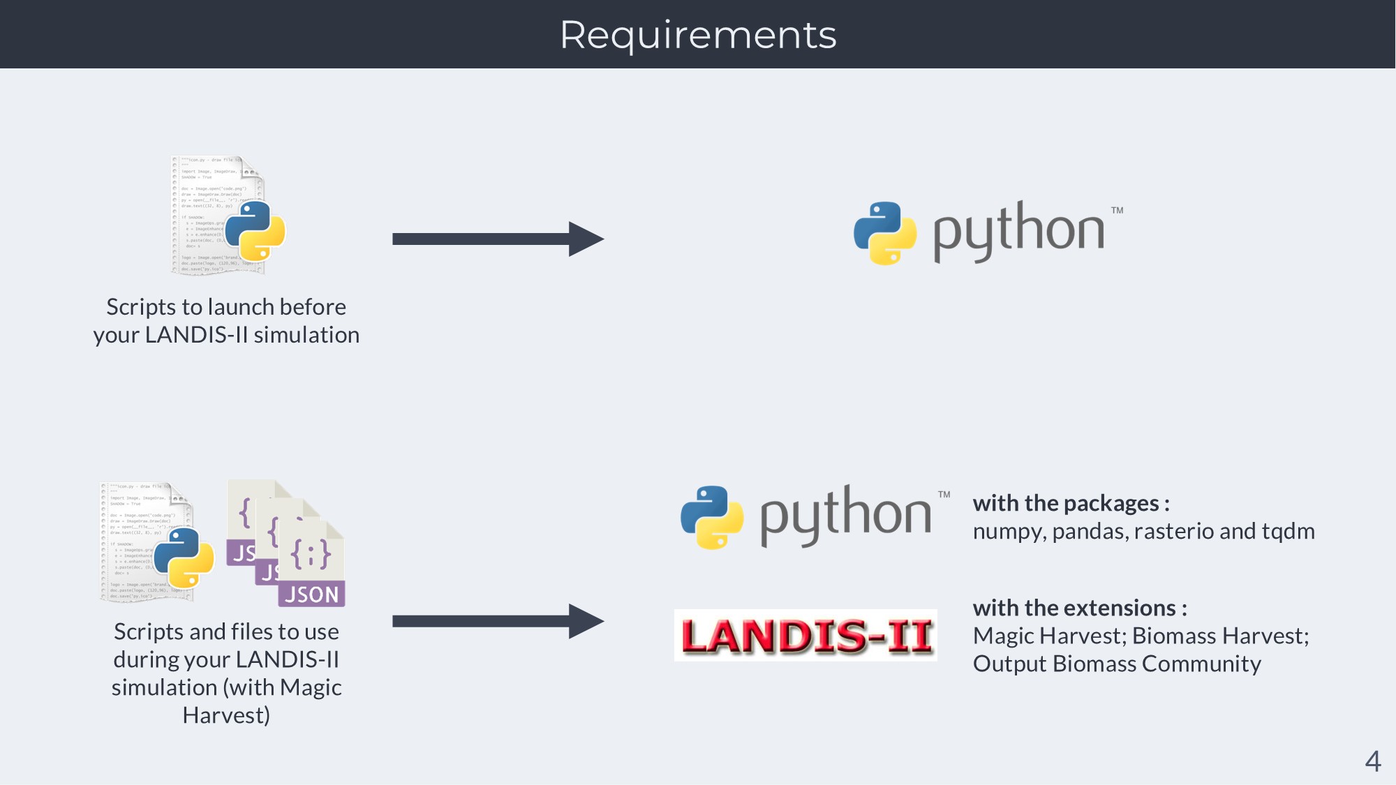 The scripts to use during the LANDIS-II simulation require Python with 4 packages installed (instructions will come after), and 3 LANDIS-II extensions : Magic Harvest (to run the Python scripts of MHS-CBAU at each timestep); Biomass Harvest (to execute the harvesting after the scripts of MHS-CBAU have taken the management decisions); and Output Biomass Community (to output a file containing the state of the landscape which the MHS-CBAU script will read to get informations about the landscape).