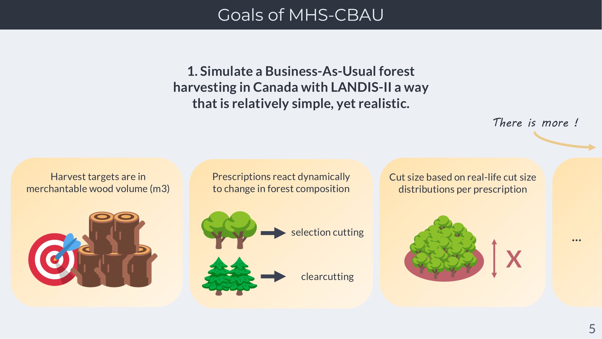Goal 1 : simulate a Business-As-Usual forest harvesting in Canada with LANDIS-II a way that is relatively simple, yet realistic. We harvest empirically-based harvest targets in wood volumes; Prescriptions react to changes in forest composition; cuts are done in patch that vary in size based on real-life cuts; etc.; and there are more things, like including some non-commercial treatments (thinning), prescriptions possibly being repeated or have a second pass (e.g. Shelterwood, Seed-tree), etc. Dealing with merchantable wood, in particular, makes it easier to parameterize and to communicate with foresters, as their main unit of profit is merchantable wood volume (and not biomass, which is what LANDIS-II uses, and which is more used by ecologists).